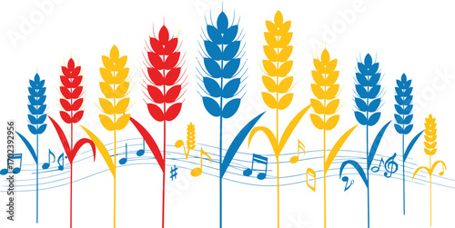 Festive arrangement of colorful wheat stalks paired with dancing musical notes expressing harmony