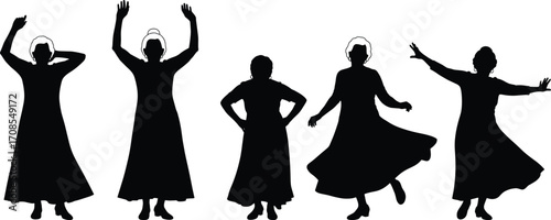Black silhouette vector illustration of women dancing in long flowing dresses with expressive movement poses, graceful choreography, performance art design