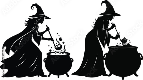 woman in Flamenco fan dance pose, Two elegant silhouettes of women in traditional flamenco dresses, holding fans, are presented against a plain white background.
