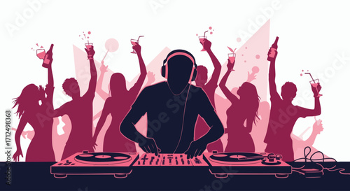 DJ and crowd dancing at a vibrant party with drinks and music.
