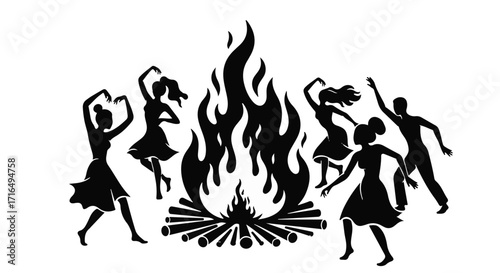 Silhouettes of people dancing joyfully around a vibrant bonfire at night.