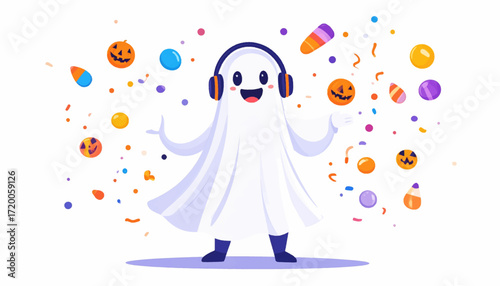 Fun-loving cartoon ghost wearing headphones and dancing joyfully among falling confetti, an ideal illustration for celebrations, music events, or playful Halloween designs