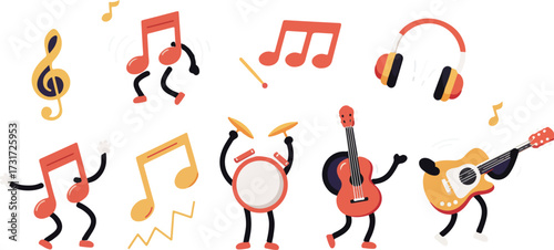 Musical notes. Treble clef on sheet music. Musical note icons in grunge style.