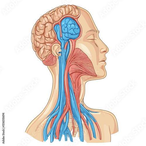Anatomical Illustration of Human Brain and Vascular System with Cross Sectional View and Detailed Internal Structures in Vector Art
