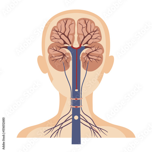 Detailed Anatomical Illustration of the Human Brain and Vascular System Showing Cerebral Circulation and Neurological Structure on White Background