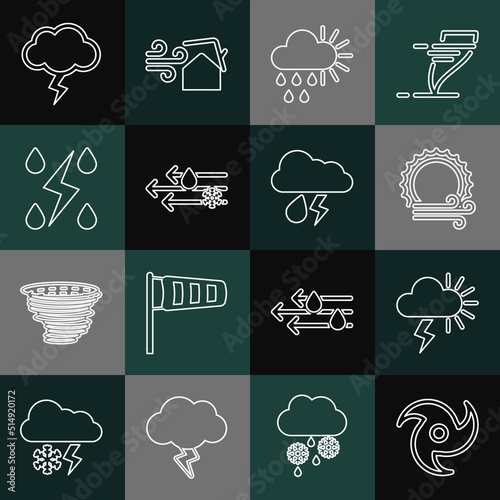 Set line Wind and rain, Tornado swirl, Cloudy with snow and icon. Vector