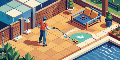 Man cleaning patio near hot tub and pool in a modern backyard with plants, seating area, and tile flooring on a sunny day