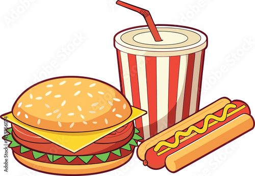 Fast food illustration with burger, fries, pizza, hotdog, donut, soda drink, flat cartoon style, junk food clipart, colorful vector