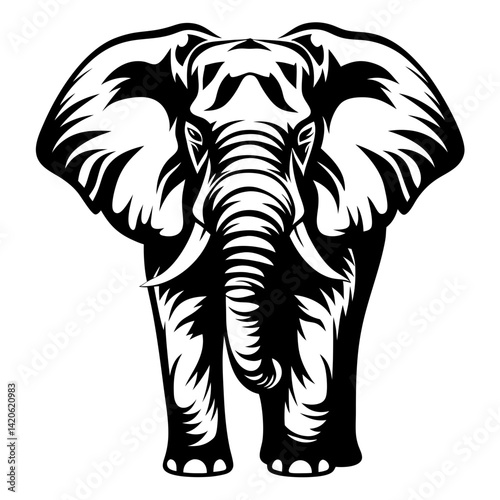Striking elephant illustration showing front view of elephant head with tusks. This elephant illustration makes an impressive statement, showcasing powerful features.