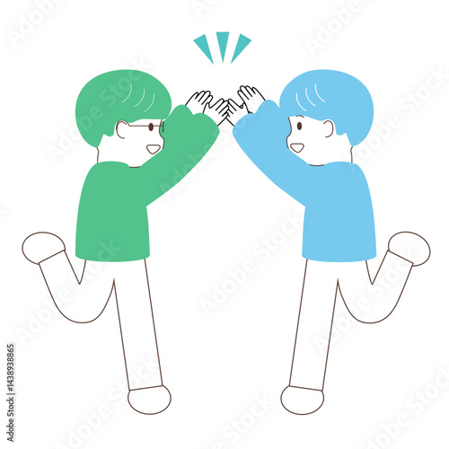 笑顔でハイタッチをする男性2人のビジネスマンのおしゃれな線画アイコンベクターイラスト / オフィス / ラインアート