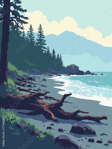 Haida Gwaii, British Columbia, Canada – driftwood-strewn beach framed by dense cedar forest and foggy ocean, no people