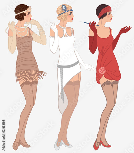Vintage flapper dancers, 1920s fashion, Charleston dance, retro party, Great Gatsby style, art deco elegance, silhouette women, fringe dresses, headbands, feathers