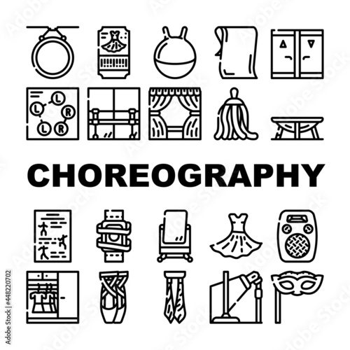 Line style icons of dance: ballerina icon, dance shoes badge, movement pose tag, dance floor file, choreography board, ballet bar chart, dance routine bubble, dance style symbol.