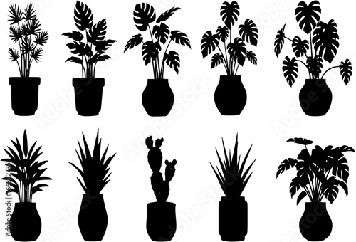 Tropical leaves and floral silhouette vector set with exotic plant shapes and botanical elements in black and white style