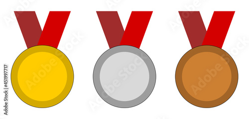 Gold, silver and bronze medals with red ribbon flat vector icons for sports apps and websites