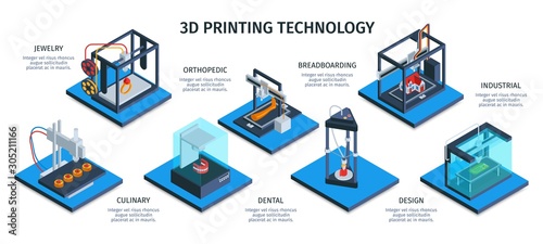 Infographics with the main available 3D printing technologies. 3D printing Technology, Definition and Types. Additive manufacturing. Vector illustration