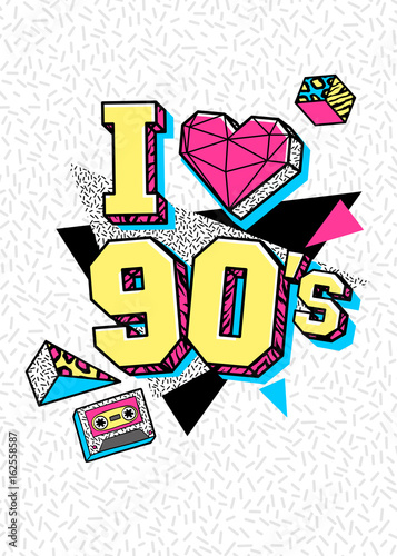 Back to the 90's. Colorful poster with lettering, abstract geometric shapes, audio cassette, sneakers and retro gamepad. Event or party invitation design in 1990s style. Vector illustration.