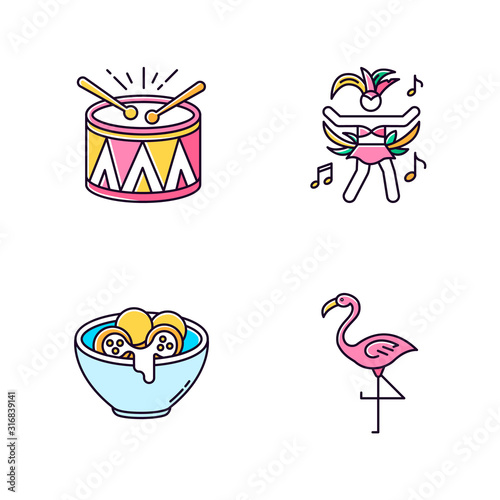 Brazilian carnival pink RGB color icons set. Traditional music. Arancini. Festive drum parade. National festival. Flamingo. Cheese bread. Samba. Local cuisine. Isolated vector illustrations