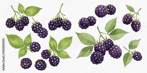 A collection of fresh, ripe blackberries with green leaves and stems, including whole and sliced fruit illustrations.