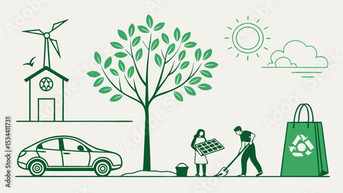 People interact with sustainable technology and green energy solutions for a healthier planet and ecofriendly future, showcasing environmental awareness and innovation.