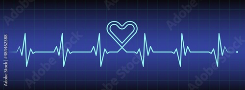 A green heart beat electrocardiogram wave on a medical monitor forms a healthy heart shape graphic to illustrate life rate and pulse health through a blue EKG cardiogram line