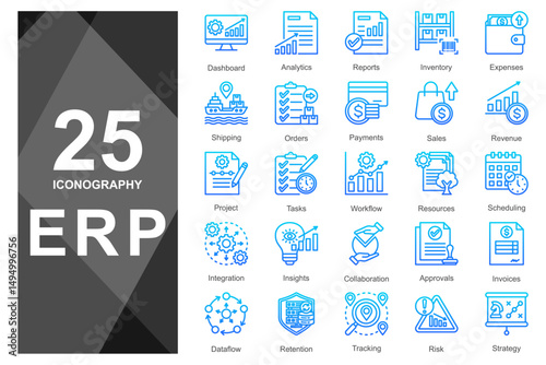Blue duotone line icons for ERP systems and analytics.