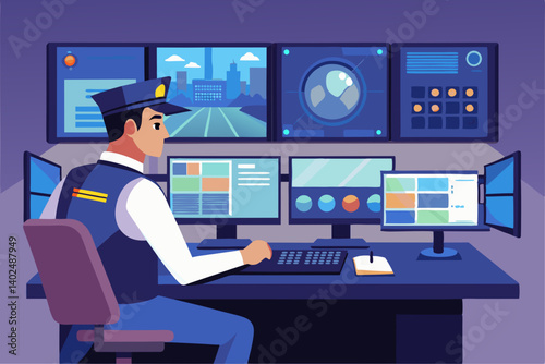 Security guard monitoring surveillance cameras on a computer screen displaying multiple live feeds illustrating vigilant observation and threat