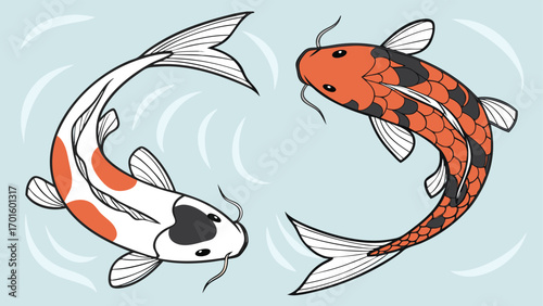 Two stylized koi fish, one orange and black, the other white and orange, swimming in a circular motion on a light blue background
