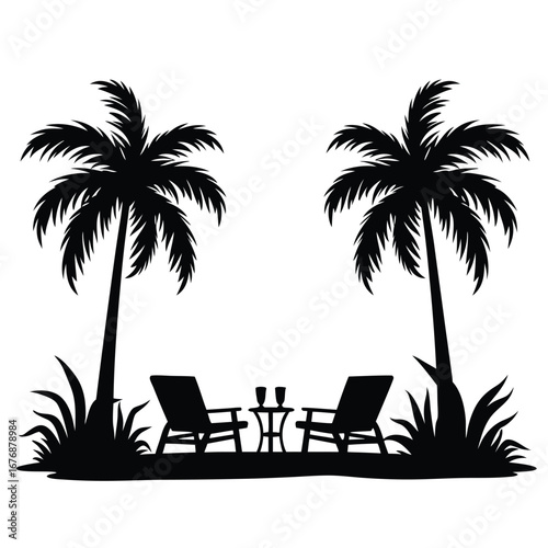 Stylized Illustration of a Tropical Poolside Scene with Palm Tree.