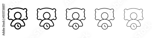 Minimalist sleep essentials line icon set. Vector symbols for bedtime, relaxation, and healthy sleep routine. Includes pillow, moon, lamp, alarm clock, sleep mask, and bed.