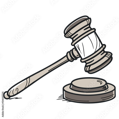 Simple line art illustration of wooden judge gavel and block, legal justice symbol for law firms, courtroom decisions, auction and authority concepts