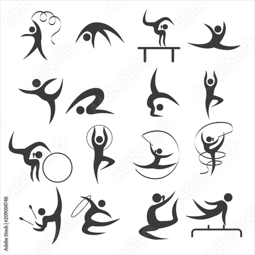 Acrobat and gymnast silhouettes set, aerial ring performance, balance beam poses, artistic sport motion shapes, flexibility training vectors, dance