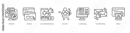 Traffic Control System banner web icon set vector illustration concept with icon of ad blocker, backlink, social media marketing, consumer, landing page, email marketing, adware