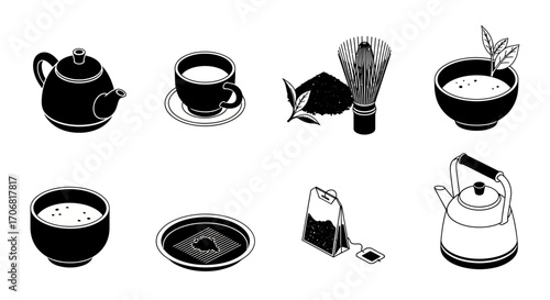 Collection of tea related icons including teapots and cups with leaves and steam in black and white