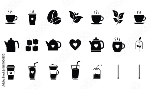 Collection of tea related icons including teapots and cups with leaves and steam in black and white