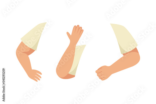 Injured human arms. Bandaged elbows and forearms, damaged arm parts, emergency treatment for bones fractures and sprains flat vector illustration set. Physical injury bandages