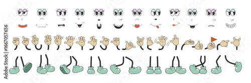 Collection of comic faces, legs and arms for retro characters of 70s. Comic faces in different emotions happy, angry, sad, cheerful. Cartoon character faces, legs and arms in different poses.
