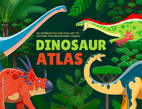 Prehistoric dinosaur characters atlas book cover template. Paleontology vector brochure, dinosaurs book cover with antarctosaurus, styracosaurus, melanorosaurus and raptor dinosaurs characters