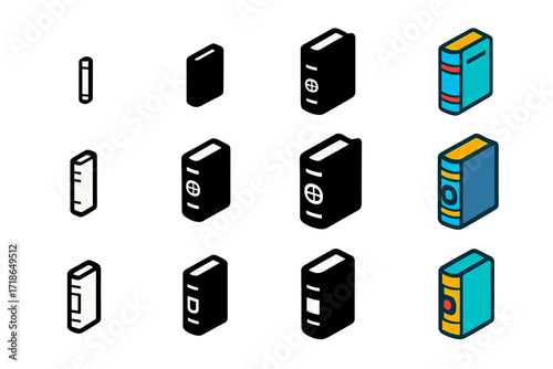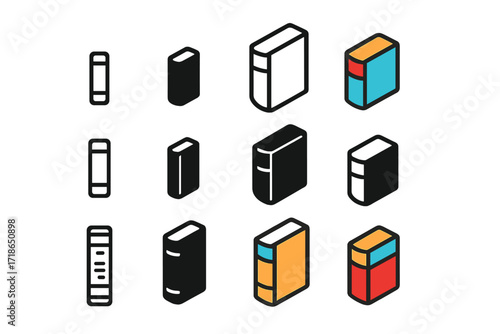 Book Spine Icons. Icon Set of Miniature and Large Book Spines: Tiny book spine, Oversized atlas spine, Pocketbook spine. Icons set in vector style, emblematic