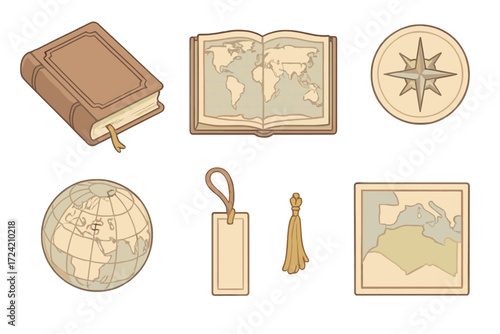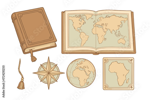 Antique Atlas Illustration. Isometric vector illustration set atlas book world countries: antique atlas leather cover, aged page