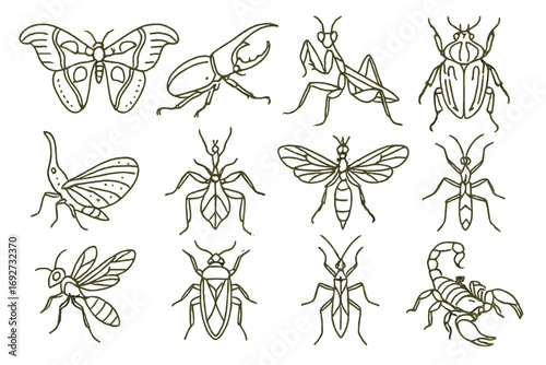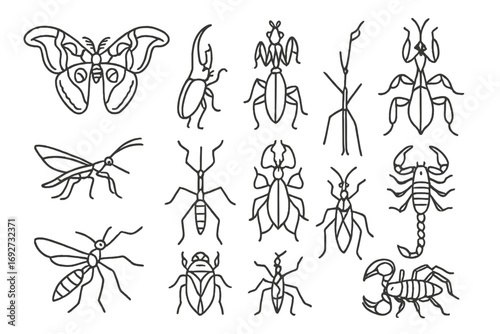 Jungle Insect Icons. Outline icon set of jungle insects & arachnids: leafcutter ant, morpho butterfly, goliath beetle, atlas moth,