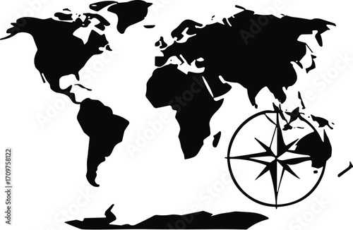 World Map with Compass Rose Vector Graphic for Travel and Exploration