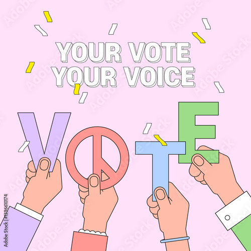 Election concept banner. Vote. Hands of diversity group of people holding paper ballots. Fair voting and opinion. Vector illustration