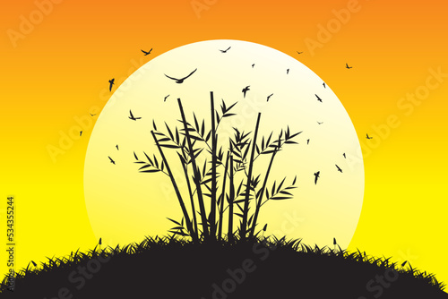 Bamboo tree sunset. Illustration of a beautiful landscape at sunset with a silhouette of a bamboo tree