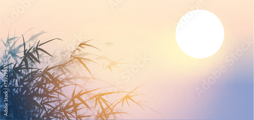 An ink illustration of bamboo against a rising sun, Japanese and Chinese aesthetics. Art for decoration. Painting of beauty of nature, perfect for spa and wellness designs. Not AI.