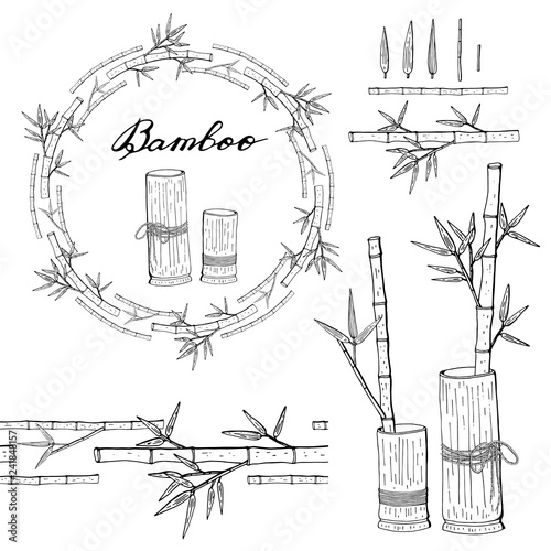 Hand drawn illustration with bamboo stem and leaves. Set of bamboo tree leaves. Hand drawn botanical collection. Drawing of parts of bamboo and sections of branches and leaves on a white background.