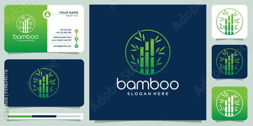 bamboo logo design with creative circle frame template. Tree bamboo, Green with icon and business card. Premium vector