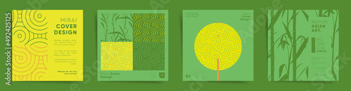 Geometric asian design square template set. Japanese bamboo graphic layouts for poster, brochure, album cover, flyer, catalog, presentation background. Decorative natural summer pattern collection