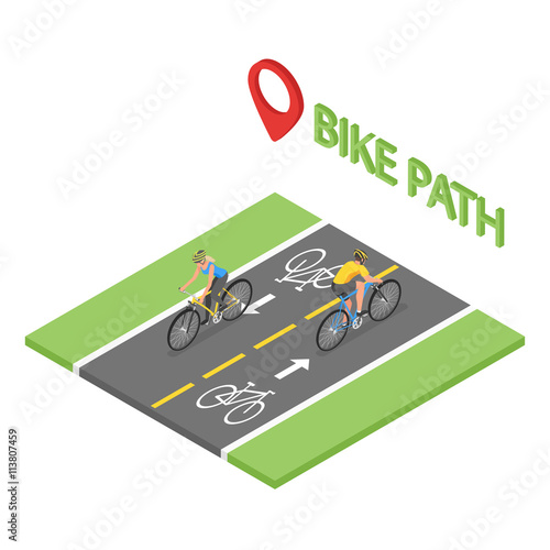 Bike walking path, cyclist traffic or road rules flat cartoon vector illustration. Cyclists use route, cycling bike rider. Biking man and active rest, pedestrian way and people