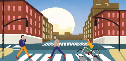stock vector cyclists and pedestrians walking street people crossing road-modern city street cityscape background